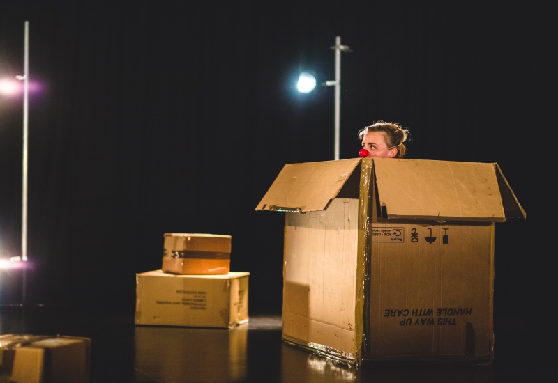 This is a playful and funny interactive children’s dance-theatre performance. Based around the character of a cardboard factory employee. He falls into a box and meets a box creature inside who tries to entice him into her box world. He gest so excited in a new world that she has to tame him and hide back into the box. All played through games and transformation using all the packaging materials.
